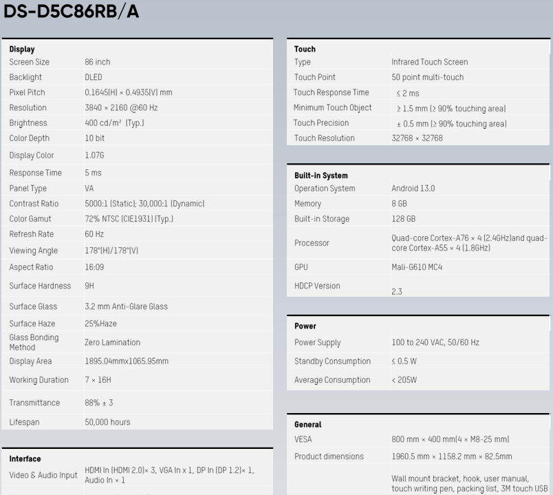 Monitor Interattivo HIKVISION 86" ANDROID 13